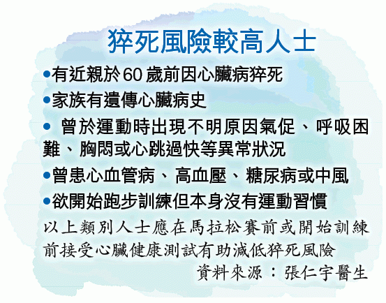 張指所有跑手都適合接受賽前體檢,高風險人士更應考慮,包括有家族心臟病史、曾出現不明原因的氣促或胸悶等異常狀況、心血管病、高血壓或糖尿病患者等。