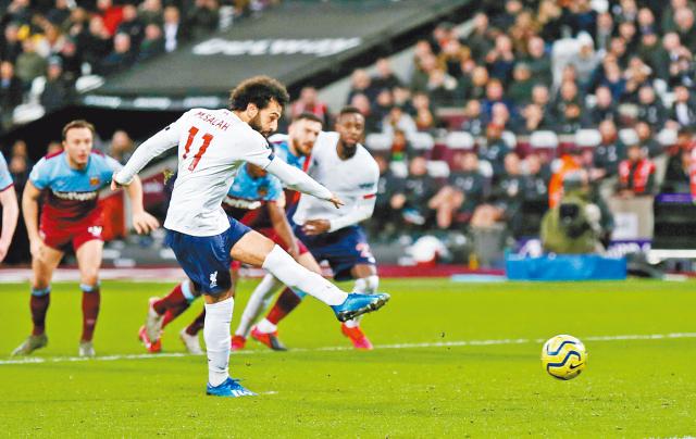 【綜合英格蘭外電】利物浦周三憑穆罕默德沙拿上半場射入12碼,加上阿歷士張伯倫下半場再建一功,作客以2:0輕取韋斯咸,在英超15連勝,於榜首拋離排第2的曼城19分,更一季內贏盡英超其餘19隊,向爭奪球隊30年來首個聯賽冠軍邁進。