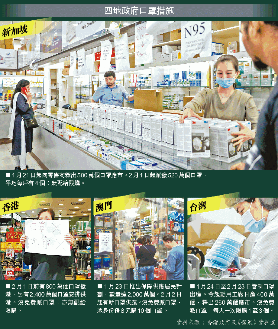 新加坡昨宣佈周六起派發520萬個口罩,平均每戶有四個。台灣今起徵用國內工廠生產口罩,每人限購最多三個,澳門亦有限購澳人購買十個的措施,惟港府拒絕頒限購令,或只限本地居民購買,商務及經濟發展局局長邱騰華表示,現時大部份買家是香港人,若硬性規定按身份購買口罩,執行上有困難。