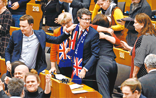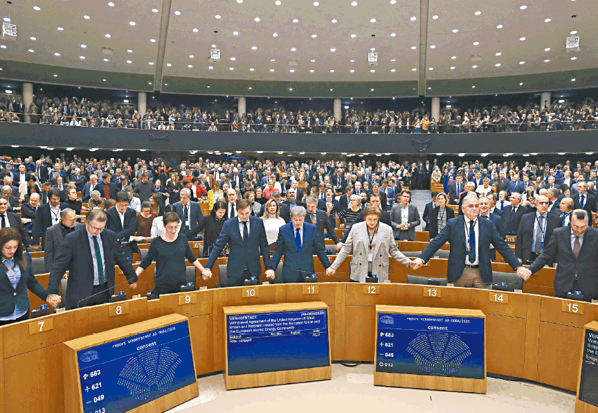 歐洲議會前天以621票贊成、49票反對和13票棄權,通過確認脫歐協議,表決後議員牽手齊唱蘇格蘭民歌《友誼萬歲》。英國脫歐黨的歐洲議員揮舞迷你英國國旗歡呼,來自西班牙的左翼進步派黨團領袖加西亞跟英國黨友道別時,卻強忍眼淚,英國工黨歐洲議員基爾頓─達令也強忍眼淚說:「這可能是我平生最悲傷的一日。英國脫歐攻擊了我們身份認同的基礎。」