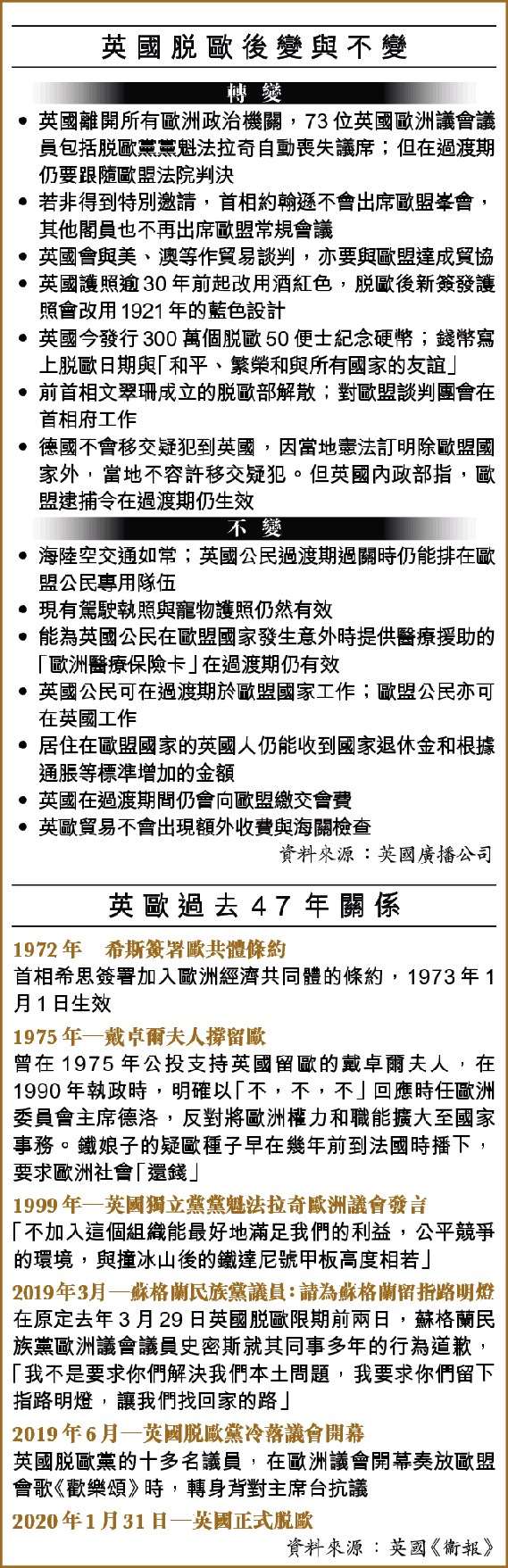 英國脫歐時間訂為布魯塞爾時間今晚12時,亦即是英國時間今晚11時,本港時間明早7時,屆時歐盟所有辦公室都會除下英國旗,英國的官方機構亦會降下歐盟旗。但除英國退出歐盟機構外,民眾實際生活變化不大,因為脫歐協議規定了直至今年年底的過渡期,雙方人員流動和經貿安排基本上維持現狀。