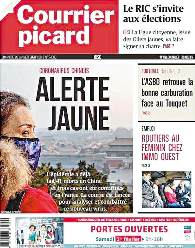 面對新型肺炎事件,不僅僅是一家法文媒體在有意無意地玩文字遊戲。1月26日,《皮卡爾信使報(Courrier Picard)》這份發行量48,000份、在巴黎以北的埃納省(Aisne)與瓦茲河省(Oise)發行的地方報,將頭版貢獻給新型冠狀病毒事件。它的標題用粗黑體搶眼打出「中國冠狀病毒,黃色警報」,讓眾多讀者震驚。不僅如此,更讓人眼界大開的是,該期社論名為「黃色危險?(Le péril jaune)」。法國新聞周刊《觀察者》事後註解:「黃色」和「黃色危險」 的定義,在歷史上都影射了針對亞洲社區的種族主義觀念。「黃色危險」的成見起源於19世紀,其目的是針對亞洲人民統治世界的危險。該份法國《世界報》旗下的周刊指出,《皮卡爾信使報》使用這些詞彙,被認為帶有種族歧視和過時,在網絡上引起震驚。