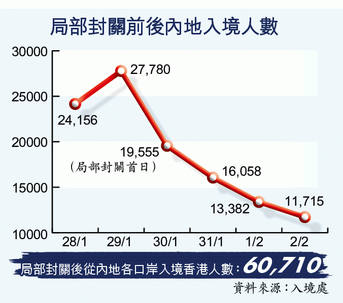 本報根據入境處數據,自1月30日實施局部封關以來,每日仍有逾萬內地人入境,截至2月2日,四日間累積60,710名內地人入境,相比局部封關前的四日,下跌約48%,成效與政府聲稱可縮減八成的講法相距甚遠。今次政府進一步局部封關,但最多內地人入境的機場,一直維持在四至五成,2月2日亦有四成人經機場抵港。但特首林鄭月娥講述措施成效時,卻將機場剔除不計算,令成效數字顯得較高。