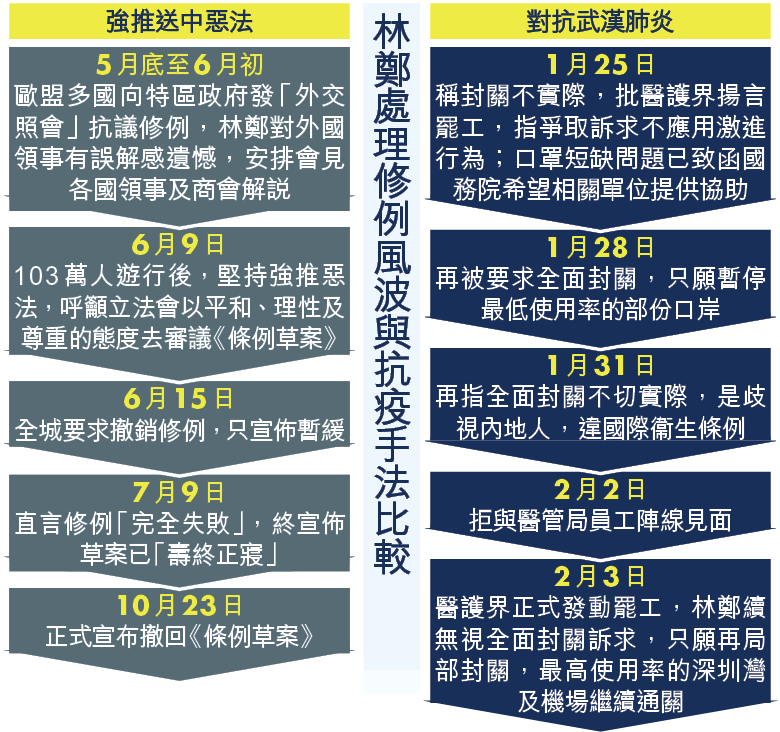 在對抗武漢肺炎疫情上,雖然上月底已有強烈聲音要求封關,醫護界亦揚言發動罷工,但林鄭卻指封關不切實際,並指責醫護界行為激進;在處理口罩短缺上,她就指已親自致函國務院尋求協助,引來譁然。面對輸入個案持續增加,封關訴求越來越強烈,林鄭最後就採取「暫緩故技」,只願暫停最低使用率的部份口岸,但市民拒絕收貨,醫護界亦發出最後通牒,林鄭卻拒與醫管局員工陣線見面,最終醫護界啟動罷工,雖然如此,林鄭昨日仍「堅持不跌入圈套」,續對全面封關說不。