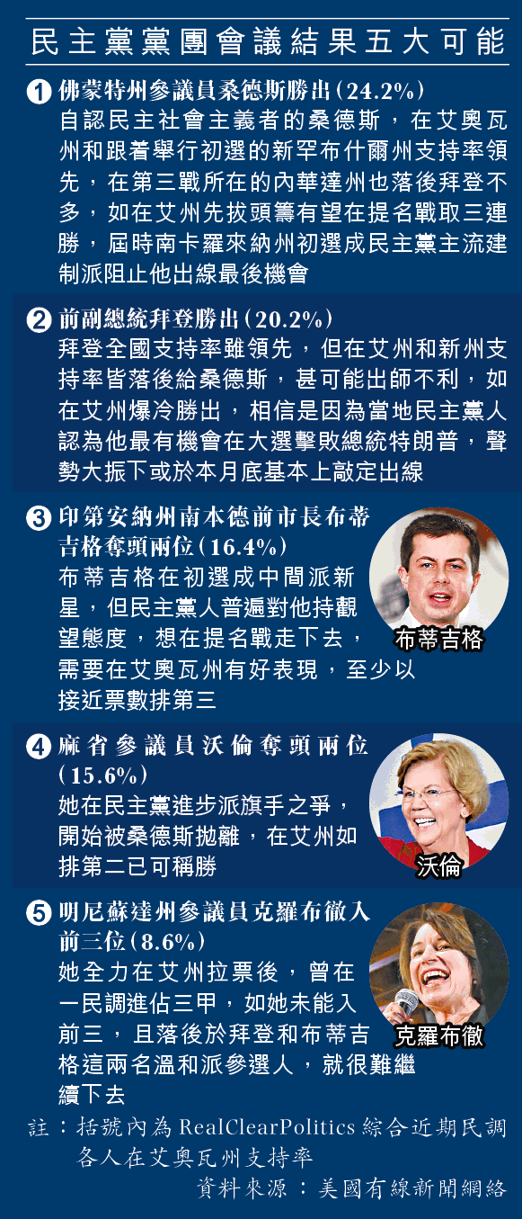 【先拔頭籌】美國民主黨總統提名戰香港時間今晨9時在艾奧瓦州開始,選前各參選人的民望接近,但該黨左翼進步派代表人物、佛蒙特州聯邦參議員桑德斯(Bernie Sanders)領先幅度不少,力爭先拔頭籌,黨內建制開始擔心他最終會贏得提名。