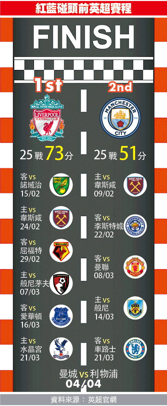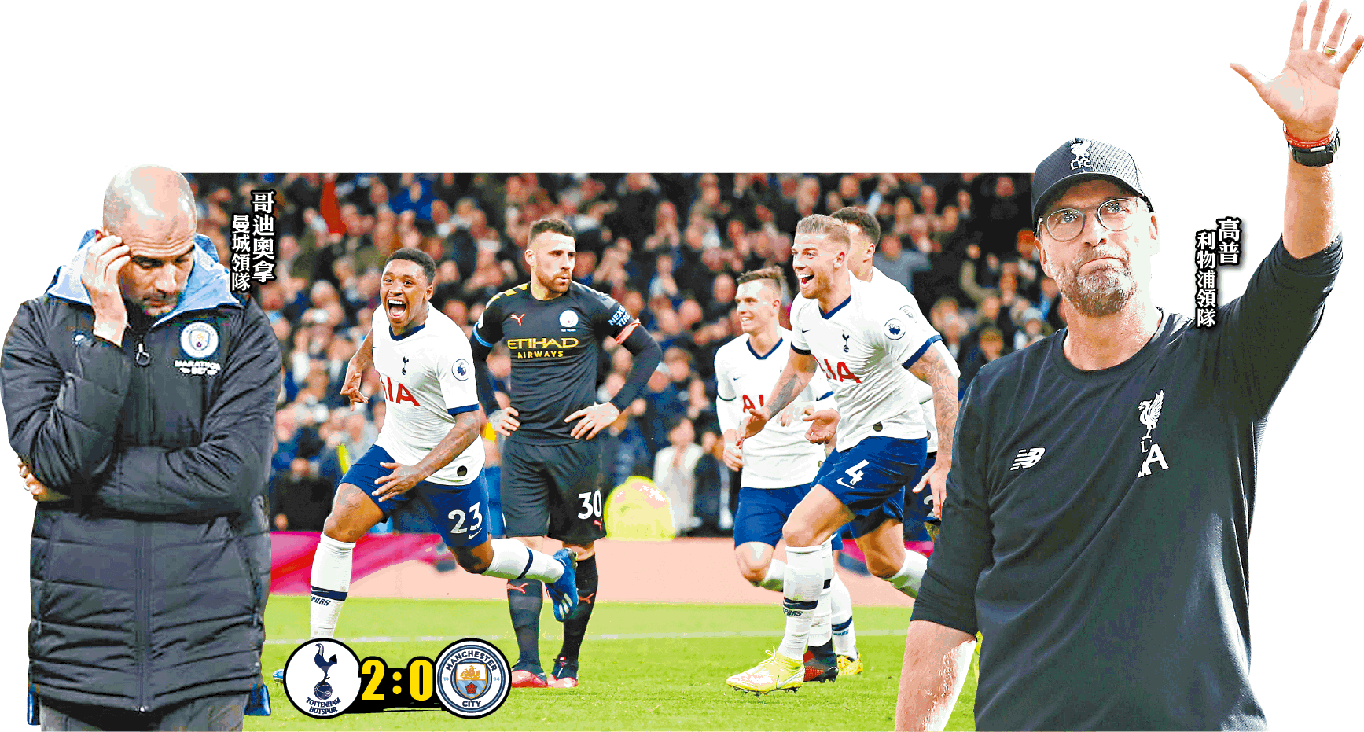 藍月失分紅軍得利。周日英超曼城作客熱刺,有攻勢有12碼卻無分落袋,以0:2敗走倫敦,令榜首利物浦確立22分領先距離,數字上紅軍只要再贏六場,在紅藍大戰前便能在3月21首奪英超,打破歷來最快封王紀錄。