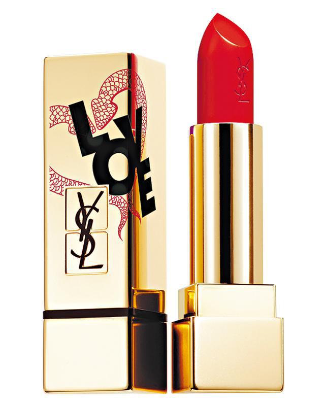 在一系列彩妝品印上愛心圖案,金色唇膏管上以「LOVE」字樣裝飾,又有象徵慾望的蛇拼湊出的心形圖案,帶來叛逆又誘人的感覺。當中有三款不同色調的紅色,還有一款花梨木紅色,適合不同膚色的女士。