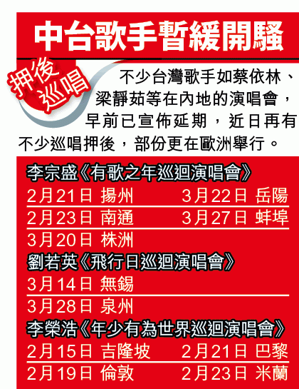 武漢肺炎肆虐,全球各個地區先後出現確診個案,為免疫情擴散,不少歌手的演唱會均宣佈取消或延期。其中,台灣音樂人李宗盛原定3月8日在黃石市舉行演唱會,早前已宣佈延期,前日他再公佈在今個月及下個月,分別在揚州、南通、株洲、岳陽及蚌埠等地舉行的演唱會,全部延期舉行。另一台灣歌手劉若英原於下月在無錫及泉州舉行巡迴個唱,其唱片公司昨日亦在微博宣佈延期,門票延期後仍有效,觀眾亦可選擇退票,劉若英在微博留言:「希望疫情早日平息,注意個人衞生,照顧家人安全。」