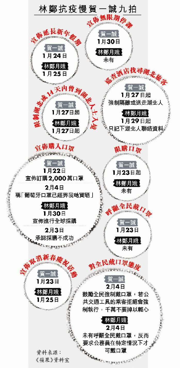 澳門特首賀一誠因應疫情抗大,不惜停賭場、要全民戴口罩,但由特首林鄭月娥領導的香港抗疫工作,不止處處慢澳門一拍,昨更提出反其道而行的抗疫指引。林鄭昨早在行會前見記者,未有戴口罩,對於她早前承諾全球都採購口罩裝備物資,她昨承認「全球包括內地採購唔係好成功」,所以必須謹慎用口罩,盡量讓優先人士如醫護使用。
