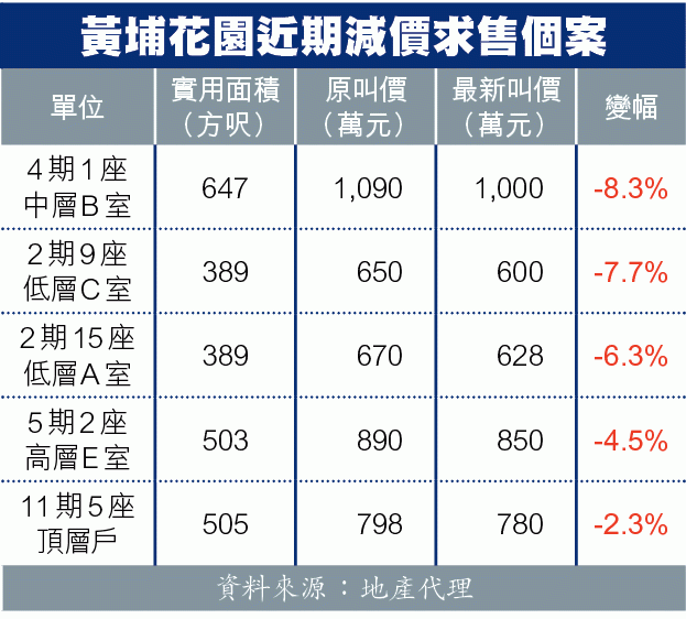 黃埔花園現有約150個放盤,最平為2期9座低層戶,實用389方呎,望園景,開價僅600萬元,比去年高峯期同類低層單位造價低逾100萬元,仍未售出。不過,據知同層有單位曾發生事故,若撇除事故樓層,屋苑入場費最平628萬元。富恒物業黃天送亦指,黃埔花園變成「疫區」,相信好多買家會暫緩入市。不過,他認為目前息口低,難預期樓價會大跌,只有個別業主肯減價,短期成交量料冰封,樓價跌幅約5%至10%。