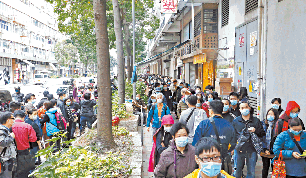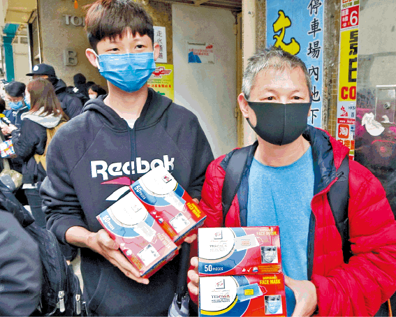 為搶購口罩保命,陳先生前日下午2時與父親一同到場排隊,父子排在隊頭附近,他表示家中尚有約100個口罩,足夠一個月使用,「啲專家講疫情最高𥧌係4月,100個根本唔夠,所以出嚟排。」排隊人龍越夜越長,不乏長者,有人更帶同帳篷、棉被、地席,約5,000人通宵冒着寒風排隊。