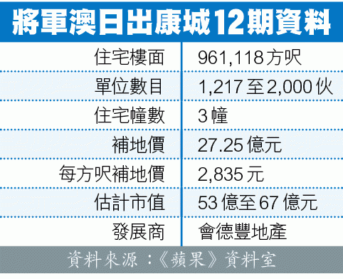 日出康城第12期可建樓面約96.1萬方呎,提供約2,000伙單位。市場消息指,每呎補地價金額為2,835元,總值約27億元。