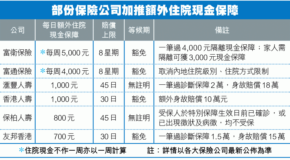 醫療保險則會按醫藥費、住院費、手術費逐項賠,上月底起陸續有保險公司加推「武漢肺炎」額外保障,包括每日600元至1,000元的額外住院現金保障,富通和富衛則分別每周發放4,000元及5,000元,上限8星期,不足一周亦以一周計。