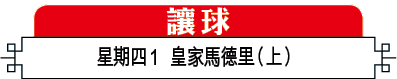 周四西班牙盃八強賽事,皇家馬德里迎戰皇家蘇斯達,「銀河艦隊」近期勝仗停不了,歇冬後7勝1和延續逾3個月不敗走勢,皇馬除了是五大聯賽失球最少的球隊,教練施丹亦會因應比賽形勢改變戰術、靈活運用進攻球員,加上前線爭位嚴重,料皇馬有力保持近年主場屢挫皇蘇氣勢,皇馬讓一球/球半捧上盤。(球賽編號:星期四1;明日2:00am開賽)