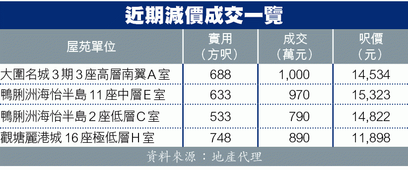 土地註冊處資料顯示,大圍名城3期3座高層SA室,實用688方呎,三房間隔,上月中以1,000萬元低價易手,呎價14,535元,比去年高位回落兩成。