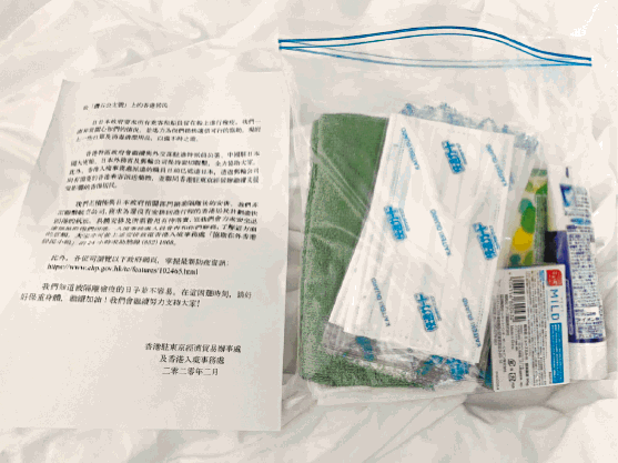 小禮包內有六個日本口罩、番𤩹、毛巾及消毒濕紙巾,不過楊和生說:「呢啲嘢其實問船公司拎都會拎到,係口罩比較有用啲」,船公司在昨日情人節亦已向乘客派特別禮物,包括蒸氣眼膜、面膜、朱古力、潤唇膏及玫瑰花等,相對地禮物似乎更豐富。