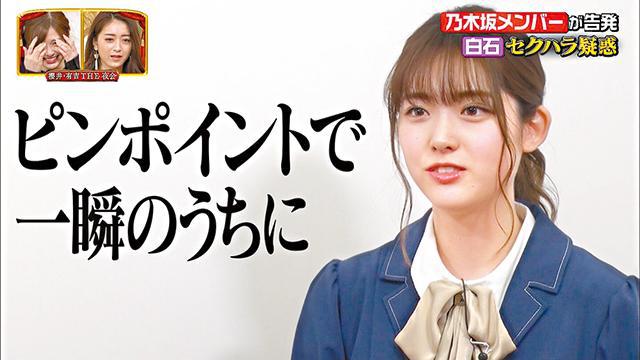 貴為寫真女王的白石麻衣,亮相前晚播出人氣綜藝節目《櫻井有吉THE夜會》,其隊友松村沙友理和中田花奈卻拍片指證白石十分手多,不時向隊友鹹豬手,松村自爆曾被對方胸襲及摸屁股。