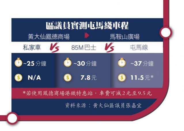 港鐵屯馬綫一期於周五情人節開通,顯徑站、鑽石山站擴建部份及啟德站三個新車站投入服務。黃大仙區議員張嘉宜昨早8時44分與助理兵分三路,乘塔港鐵屯馬綫、九巴85M及駕駛私家車,在黃大仙鳳德商場出發到馬鞍山廣場。私家車僅花25分鐘到達目的地,乘85M則需時30分鐘,較搭屯馬綫的37分鐘,快7分鐘。車費上85M為7.8元,同樣較屯馬綫的11.5元優勝。
