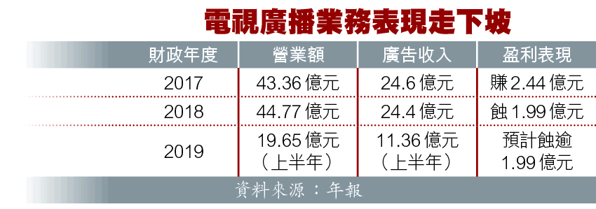 【本報訊】因新聞報道取態偏頗,被網民嘲為「CCTVB」的電視廣播(TVB,511)昨早發盈警,預料截至去年12月底的年度虧損,將較2018年的1.99億元擴大,主因是去年社會動盪及經濟不景,導致廣告收入急跌;又承認可收回餘下星美債券賬面值3.3億元的可能性不大。有分析認為,TVB面臨龐大資金及經營壓力,今年或只能象徵式派末期息。