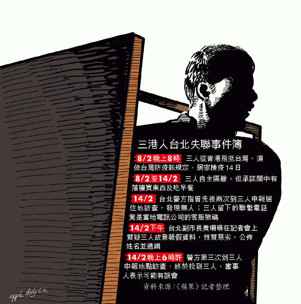 【本報訊】武漢肺炎蔓延全球,台灣宣佈收緊港澳人士入境安排,曾規定港人入台須強制隔離14天。台灣當局昨公佈四名港人在台隔離期間「失蹤」,其中一家三人涉「惡意亂填」入境表,令警方無法跟進,因此開名通緝,昨傍晚尋回三人,但另一人仍在逃。當事人之一張先生昨向《蘋果》指,他們8日晚上到台灣後遵從指示,持續多日隔離,承認曾幾度落樓買食物,稱事件屬誤會及疏忽。張與家人昨由台北警方安排強制隔離至22日。
