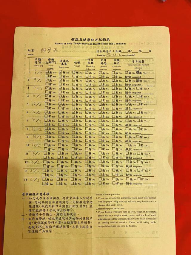 張表示當時打算留台三周,最後一周才觀光,「台灣未宣佈時打算(留台)7日,台灣話要14日(隔離),就14日再加7日,即係21日」。他們赴台前已預訂台北市萬華區武昌街一間Airbnb民宿,抵埗後在便利店購買杯麵及水等,開始隔離生活。他承認期間曾幾次落樓買杯麵和水以及吃早餐,但都有戴口罩,「(民宿)冇廚房,只有廁所及一個熱水壺,無可奈何只好落樓」。