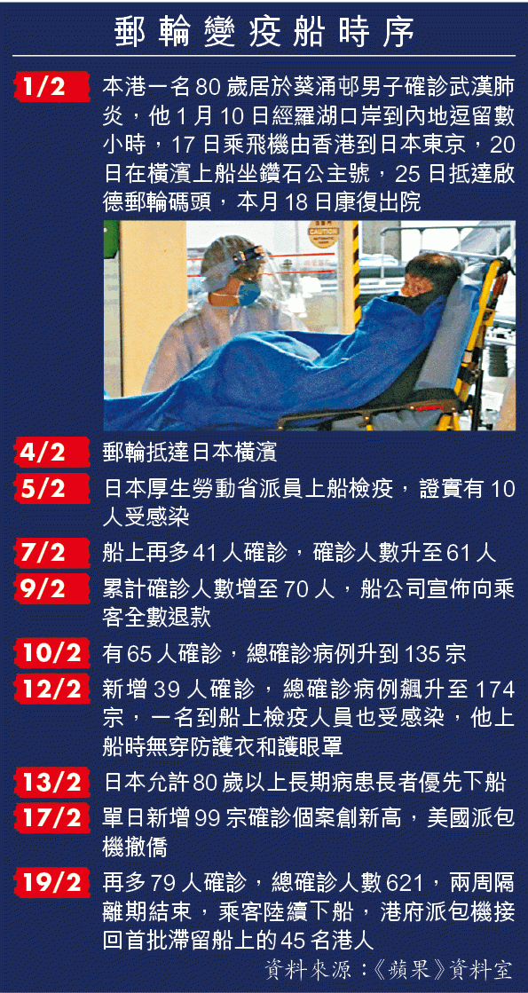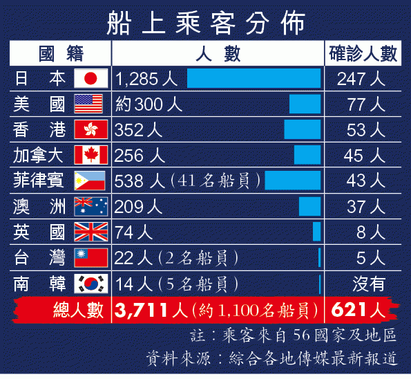 鑽石公主號昨累積病例達621宗,岩田健太郎教授在前日上載到YouTube的影片和昨日各傳媒的訪問中,描述前日登上鑽石公主號後的見聞,指船上避免疫情擴散的措施完全不足,雖設有感染風險的紅區和安全的綠區,但無特定保護衣穿脫區,船員可自由來往紅區和綠區,發燒乘客甚至可自行前往醫療室,而他本人亦曾和病人擦肩而過,而且不是所有官員、船員和醫護人員都穿保護衣或戴口罩,船上一個常駐的傳染病專家也沒有,形容船上一片混亂。他曾處理非洲伊波拉、中國沙士和其他國家霍亂疫情,「我從不害怕自己感染,但在鑽石公主號內,我非常膽怯」。