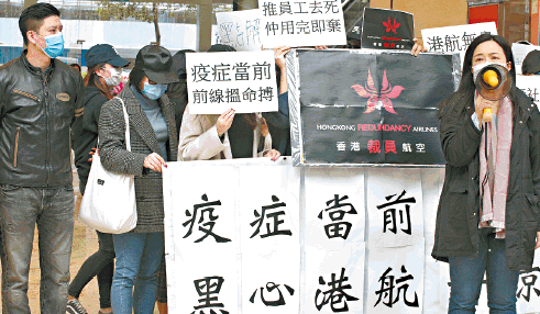 數十名港航員工昨天由立法會議員譚文豪、空勤人員總工會理事兼職工盟主席吳敏兒及代表律師陪同下,前往港航位於葵涌KCC的辦公室抗議,但港航僅答應與三名員工,帶同譚文豪及律師會面;任職近10年、剛被解僱的機艙服務員代表May表示,被裁員工不乏高年資或獲良好表現獎的同事,「噚日已經話係最後一日工作日,但畀一個月通知,話下個月先完合約,用7,800蚊一個月做代通知金,我哋𠵱家帶住7,800蚊點搵工?」她坦言在疫情下,不知如何尋找新工作。