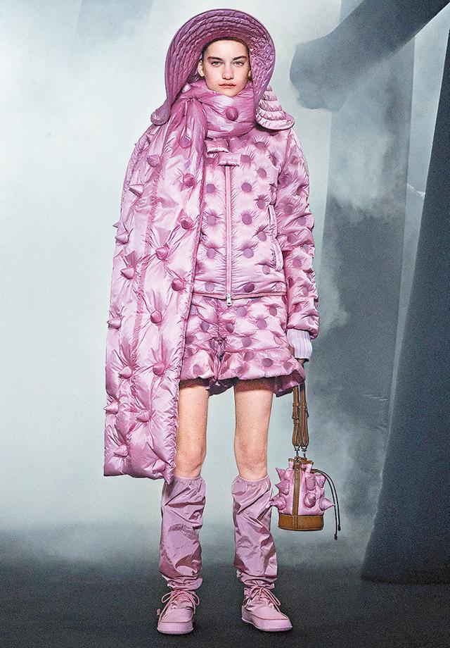 首次加盟的JW Anderson,將以往男、女裝元素、細節與輪廓糅合羽絨服,荷葉邊的短褲、超闊邊的漁夫帽、長了刺的羽絨造型,有如怪獸,帶來獨特美學感。Simone Rocha在「電影院」展示系列,新季加入了薄紗、皺褶、小花刺繡等元素,帶來芭蕾舞裙與羽絨服的混合體。Richard Quinn繼續帶大家走進花花世界,由復古的迷你裙,再到浮誇華麗的晚裝造型,都將印花發揮得淋漓盡致。Craig Green以黑白的日本武士造型,衝擊大家視覺,Fragment則以招牌閃電圖案配合實用性。