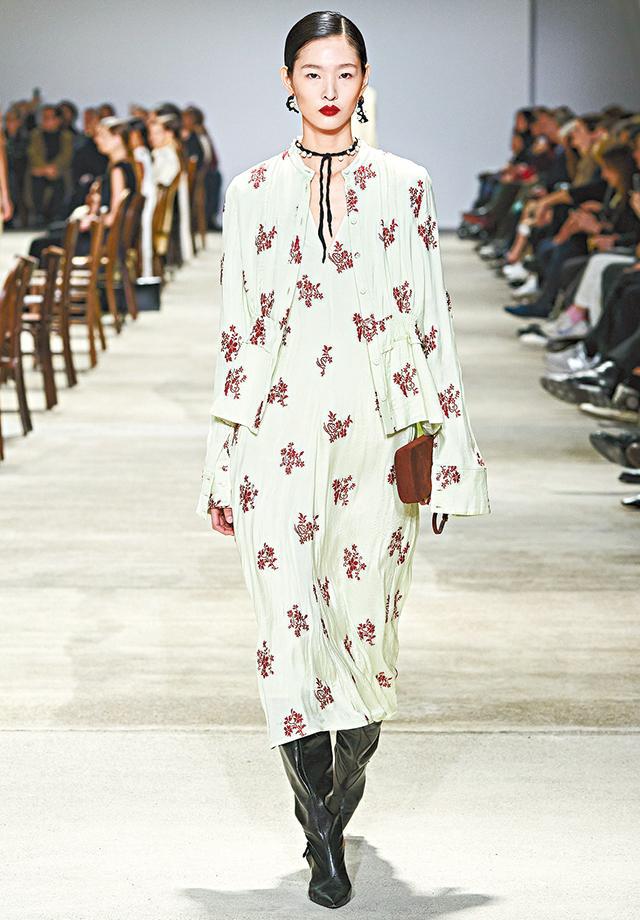 女性化和男性化一體的黑大衣,輪廓男性化但腰間有矯形胸衣的支架剪裁,西裝、男裝外套有束腰或泡泡袖外露的造型,剛柔並濟。裙裝不再以廓形為主導,相反一面倒展現女性美,絲質長裙輕巧飄逸、又有重工打褶營造豐厚效果、以工藝展示品牌不再只有「簡約」,以複雜的技巧呈現簡約設計,貫徹「反差」主題,另外,有對比質料的拼湊,如絲質荷葉邊和chunky knit組合。設計師特別着重物料和顏色的運用,絲質製成的流蘇、皺褶裙、荷葉邊,垂墜波浪,加上黑、淡黃、粉紅,誰也不搶誰的風頭。
