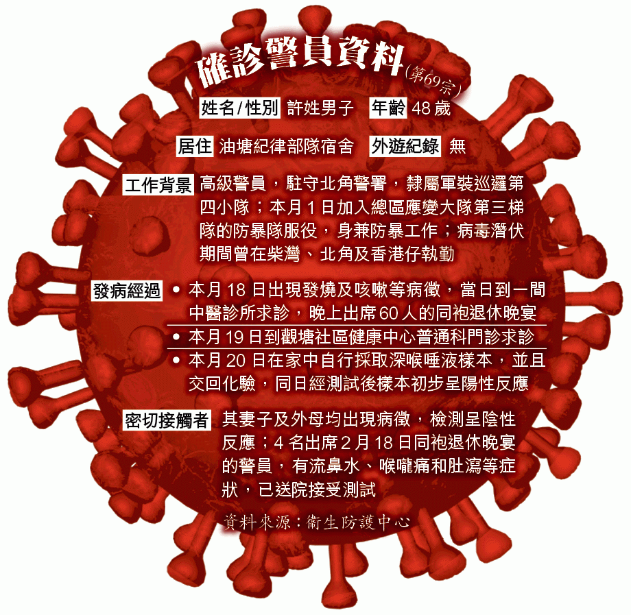 本港第69宗武漢肺炎確診者、48歲許姓高級警員帶病出席同袍退休晚宴,隨時引發比「邊爐家族」更龐大的傳播鏈。衞生防護中心傳染病處主任張竹君表示,周二的警員退休聚會除用餐外,亦有其他活動,且時間長達四個半小時,故59名出席警員全被列為密切接觸者,將陸續安排入住檢疫中心。她呼籲患病人士不應上班,特別是工作上需要面對人群的人士。