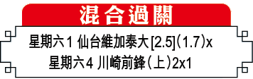 至於仙台今季從鳥棲砂岩羅致的艾錫古恩卡雖季前受重傷需休養半年,不過隊中的U21小將田中涉上場對浦和紅鑽獨取2球,有望成為仙台的一路奇兵。仙台與名古屋皆為攻強守弱球隊,今場可望上演入球騷,敲入球中位數[2.5球]的「大」。