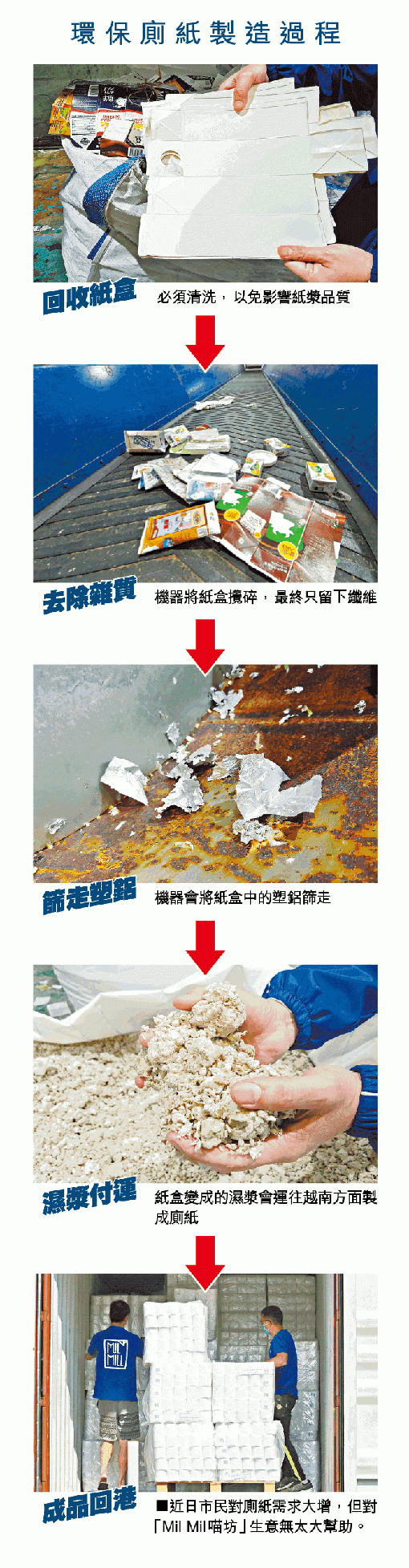 去年10月,mil mil喵坊與越南紙廠合作,以回收的廢紙及飲品紙盒製造環保廁紙,機器每日可處理10噸紙盒,惟回收量不似預期,僅為預計的一成左右;因此四個月以來,廁紙皆由廢紙所造,至今售出約1.8萬條。Harold解釋,以廢紙及紙盒製造廁紙,消耗率極高,100噸廢紙只能生產約60多噸廁紙及抹手紙。