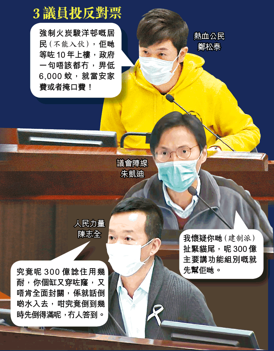 立法會昨由早至晚審議300億元「防疫抗疫基金」撥款申請,最終以59票贊成,3票反對下通過。投下反對票的議會陣線朱凱廸和人民力量陳志全指,政府拒絕透過抗疫基金向全民派錢,未能符合市民期望,抗疫基金應讓人人受惠,而非針對個別行業:「咁嘅方案唔值得(財委會)全票通過。」同樣投下反對票的熱血公民鄭松泰批評政府大灑300億元,目的是掩飾起初拒絕全面封關的錯誤,斥政府因對疫症不作為,才有此不必要的開支。