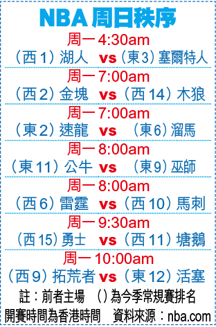 另外,原定上月底上演的「洛城打吡」湖人大戰快艇,因傳奇球星拜恩(Kobe Bryant)意外在空難離世而延期,聯盟上周五宣佈賽事將改期在美國時間4月9日在史達普斯中心進行。