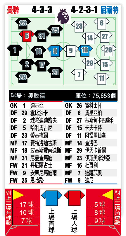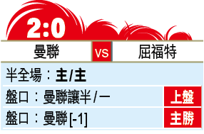 客軍屈福特找來皮雅臣掌帥後,聖誕賽期曾經打出一波3勝1和走勢,其中一仗就是主場以2:0擊敗曼聯,不過球隊近期狀態明顯回落,各項賽事已五場不勝,當中最經典必數主場迎戰愛華頓一仗,球隊早段領先兩球但被追平,其後未能把握多打一人的優勢,更被對手補時絕殺,全失三分。現時處降班區的屈福特,今仗造訪曼聯難望結束頹勢,事關球隊今季作客欠佳,至今只曾擊敗榜尾的諾域治及當時狀態極差的般尼茅夫。雖然球隊陣容完整,但遇上全力爭四的紅魔實在難撐。曼聯穩奪三分,只讓半/一非常值得支持。