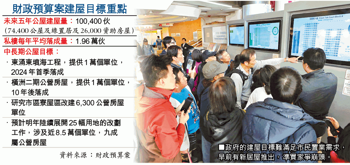 【本報訊】房屋一直是港人重視的問題,新出爐的財政預算案提到,未來五年公屋建屋量達10.04萬個單位,私樓則每年平均落成量為1.96萬伙,但翻查過去多年公私樓落成數據,大部份都較預算案估計的落後。有團體批評政府公屋目標,比逾十萬輪候公屋數目只是杯水車薪,而引入棕土發展及土地改享方式,是將未來房屋土地供應的主導權轉給發展商。