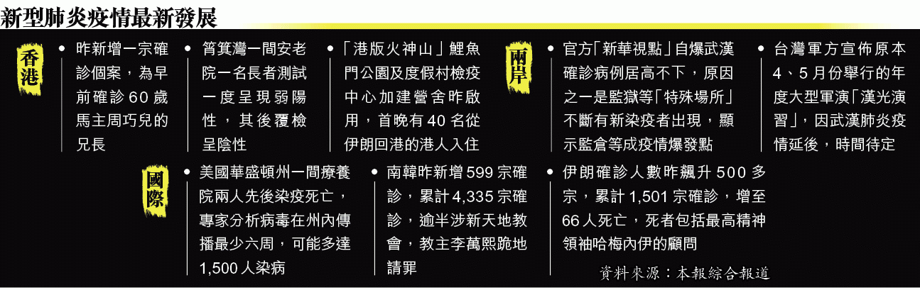 【本報訊】本港武漢肺炎確診及疑似個案突破一百大關,昨日一名63歲男子確診,是「富萬家」馬主周巧兒胞兄,兩人曾一同在兄長家中及萬豪酒店婚宴中出現。筲箕灣一間安老院因為懷疑一名院友感染而禁止親友探訪,但衞生署覆檢個案後認為該院友未受感染。