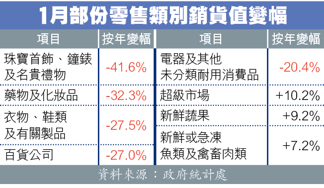 【本報訊】本港1月零售業總銷貨價值臨時估計按年跌21.4%至378億元,略遜市場預期的跌20.8%,連跌12個月。大部份零售類別跌幅擴大,珠寶首飾、鐘錶及名貴禮物,以及藥物及化妝品類別續成重災區。香港零售管理協會主席謝邱安儀表示,新春至今零售商生意蕭條,業界復元需時,料上半年零售總銷貨額按年最多減少1,206.46億元。