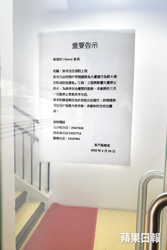 蘇志威在港開設三間洋服店及四間跳舞學校,《蘋果》昨日收到讀者爆料,指蘇志威位於美孚的跳舞學校分店於前日關門大吉,並聲稱有四名員工被炒卻沒有賠償,《蘋果》昨走訪美孚分店,發現門外貼出告示,指大廈進行為期9個月消防設備更新,沒水供應下昨日起停止營業。對於被指摘是無良老闆,蘇志威昨接受《蘋果》電話訪問時說:「我公司有百幾人,閂咗一個center,有幾個員工我唔要,係一個好正常商業行為,況且有一個未過試用期,遇到呢個時勢,公司炒你係道理,留你係人情。」