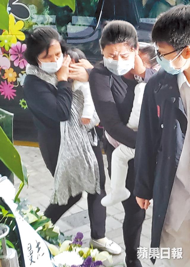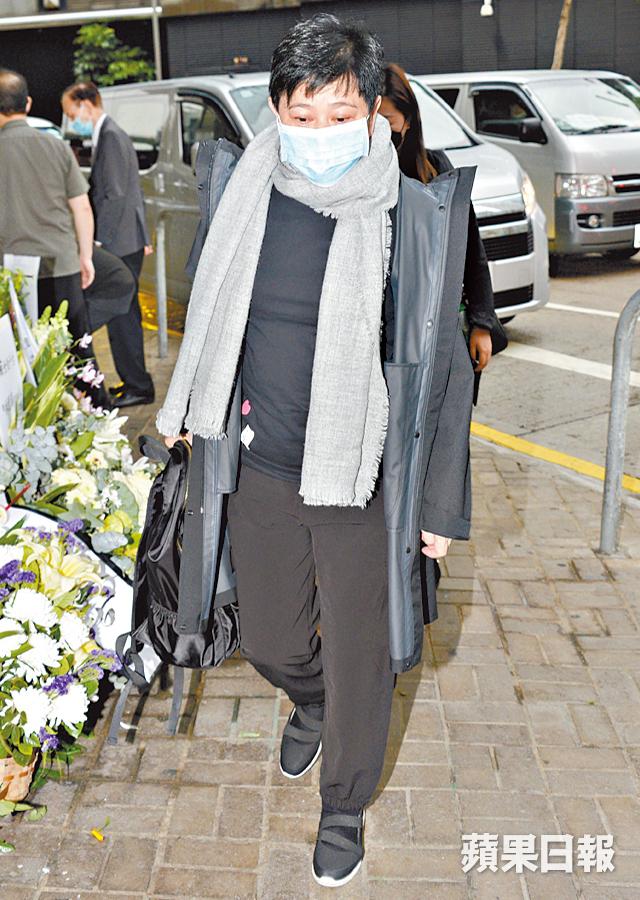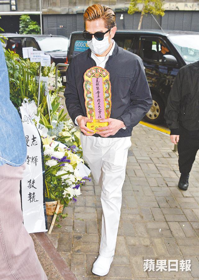 城城昨日下午3時半左右到達,一身白色孝服、外披黑色外套打扮的他雖然戴上黑超及口罩,但亦看到他神情肅穆,城城捧着媽媽的靈位牌到場,前面有一名男子手持長香引路,二人坐升降機到一樓靈堂。