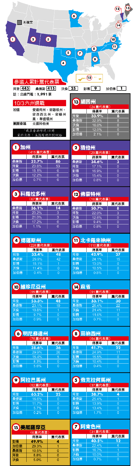 初步結果顯示,拜登前日不只一如期望橫掃南部和東南部的阿拉巴馬、阿肯色、田納西、北卡羅來納與維珍尼亞、以至西南部的德州,甚至亦把中南部的俄克拉何馬、中西部的明尼蘇達以至東北部的麻省收歸旗下;而桑德斯則稱霸西部,取下科羅拉多、猶他州和最重要的加州,以及他在東北部的老家佛蒙特州。