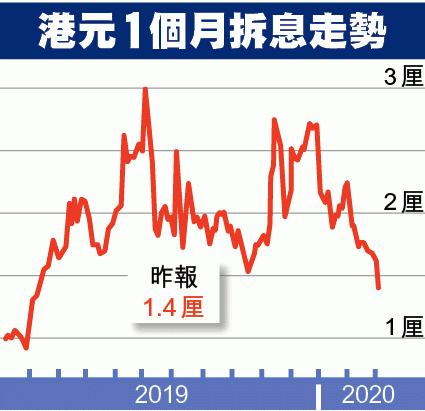 如果美國再減息,而本地因素沒有浮現,王美鳳估計1個月拆息可由現水平再跌0.25厘;惟棘手位是本港銀行體系結餘低於當年水平,一些銀行面對較高的定存業務競爭,要提高存息成本吸引資金,較利好的消息是金管局下調基本利率至1.5厘,令1個月拆息利率較難高於這個水平。
