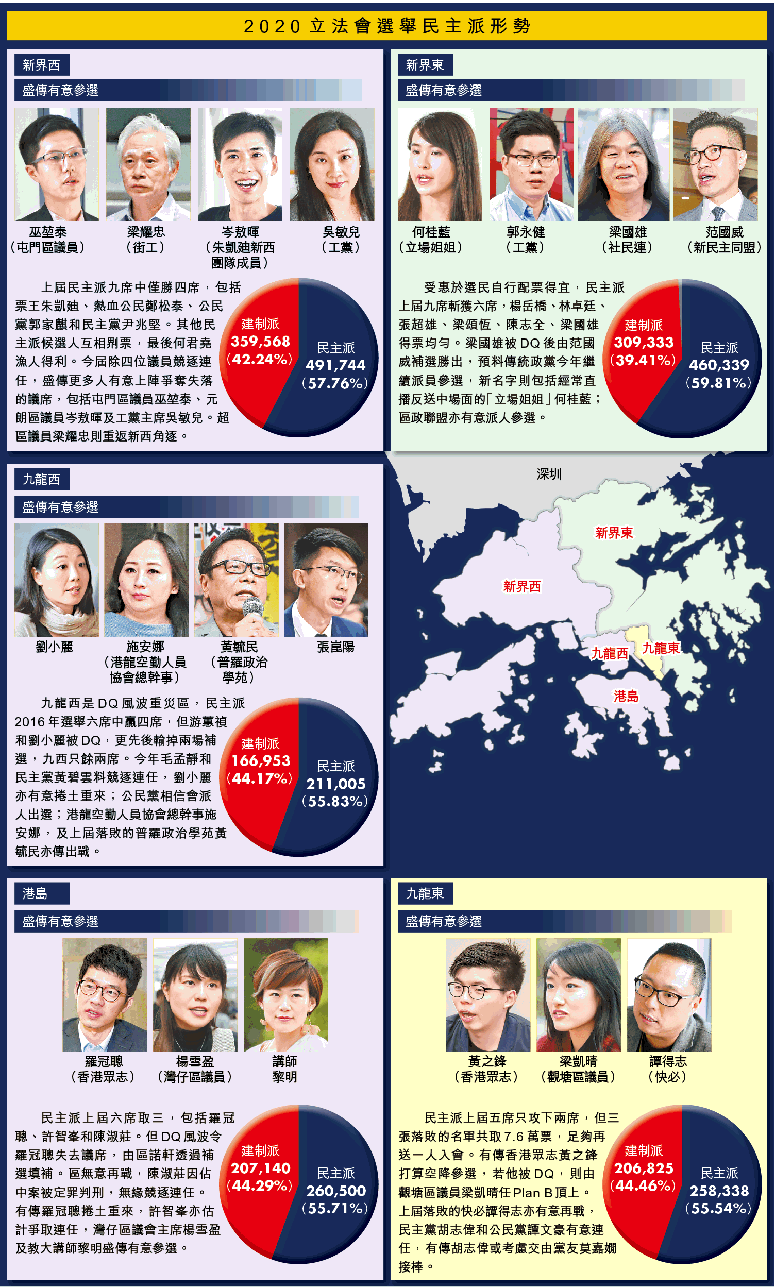 近日政圈開始流出民主派不同人士及陣營醞釀的9月立會出選名單,除一些熟悉政治人物、角逐連任議員外,當中不乏一些話題人物,除近日已曝光的黃之鋒及梁凱晴外,盛傳立場姐姐何桂藍或戰新東、灣仔區議會主席楊雪盈、教大講師黎明有可能出戰港島、眾志羅冠聰或再戰港島區,施安娜則研究出戰九西可能性,一些前議員也可能捲土重來,如長毛梁國雄出戰新東,黃毓民近日也在網台節目稱審慎考慮參選。大專學界國際事務代表團前發言人張崑陽也可能在九西出選。