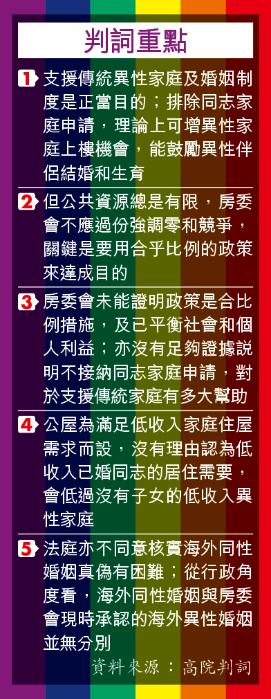 【本報訊】港男前年在加拿大與男友結婚後,以家庭資格申請公屋,惟房委會以其不符「夫婦」定義而拒絕,他遂申請司法覆核。房委會辯稱政策藉減低輪候競爭,支援市民締結傳統異性結婚,否則會影響市民結婚和生育的計劃。高院昨宣判,欠缺證據說明若接納同志申請公屋,對傳統異性家庭有何重要影響,例如延長多少輪候時間,裁定政策屬性傾向歧視,違反《基本法》。