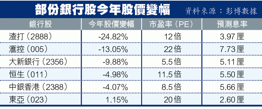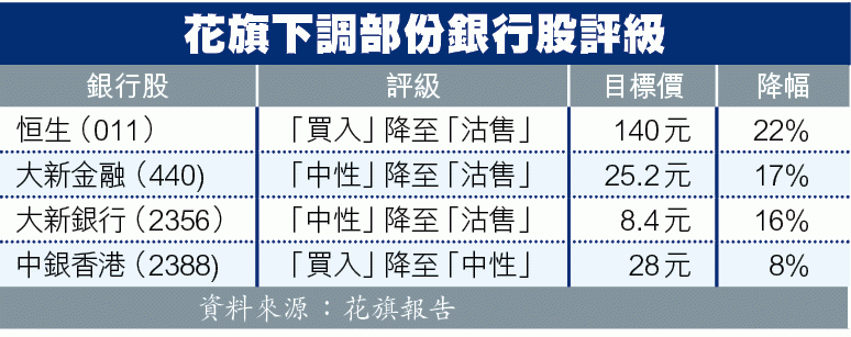 花旗發表報告將恒生投資評級由「買入」連降兩級至「沽售」,目標價削22%至140元,為該行是次調整中「最傷」。渣打(2888)及中銀香港(2388)分別跌3.3%及2.4%。本地銀行股中僅宣佈策略重組的東亞(023)有支持,升逾半成。