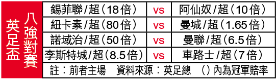 曼聯晉級後,八強所有對碰都已經產生,佢哋會作客前一日淘汰熱刺嘅諾域治爭入四強。不過,呢場波就今月下旬先打,反而紅魔應該擔心賽前扭傷足踝避戰嘅隊長哈利馬古尼,因為佢好可能缺席聽日英超對曼城嘅打吡戰。