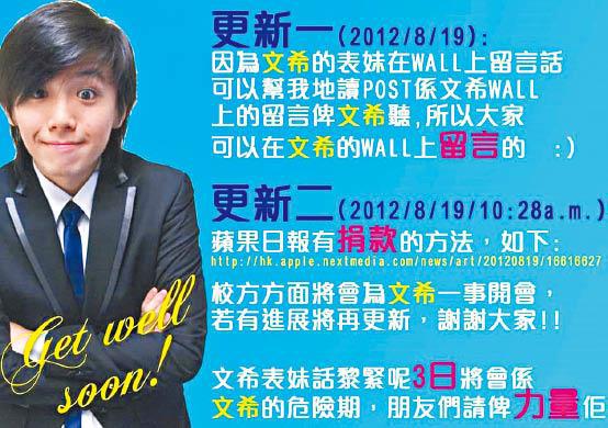 那年8月,文希在台灣單車環島遊時遇上意外,多次接受開腦手術保命,其後一直插喉住院瑪嘉烈醫院荔景大樓療養。親友、學校、話劇團也曾幫忙籌募醫藥費,有朋友成立fb專頁送上祝福,蘋果日報慈善基金亦曾為他成立專戶籌款,轉眼間已七年。和媽媽二人自小相依為命,文希乖巧而且動靜皆宜,特別疼錫母親,「每一年生日、大時大節,佢唔會買禮物,全部都係自己親手做小飾物畀我」。
