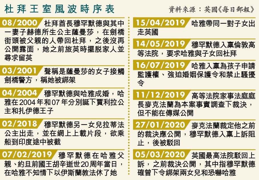 阿聯酋副總統兼杜拜酋長穆罕默德與第六名妻子哈雅婚變,去年4月女方帶12歲女兒賈利拉(Jalila)和7歲兒子扎伊德(Zayed)出走倫敦,雙方在英國高等法院家事法庭爭撫養權,穆罕默德要求帶子女回國 ,女方反對,兼申請禁令防丈夫騷擾。聆訊原閉門舉行,但媒體一直派員旁聽,最高法院前日駁回酋長禁制報道的要求後,案情始公諸於世。