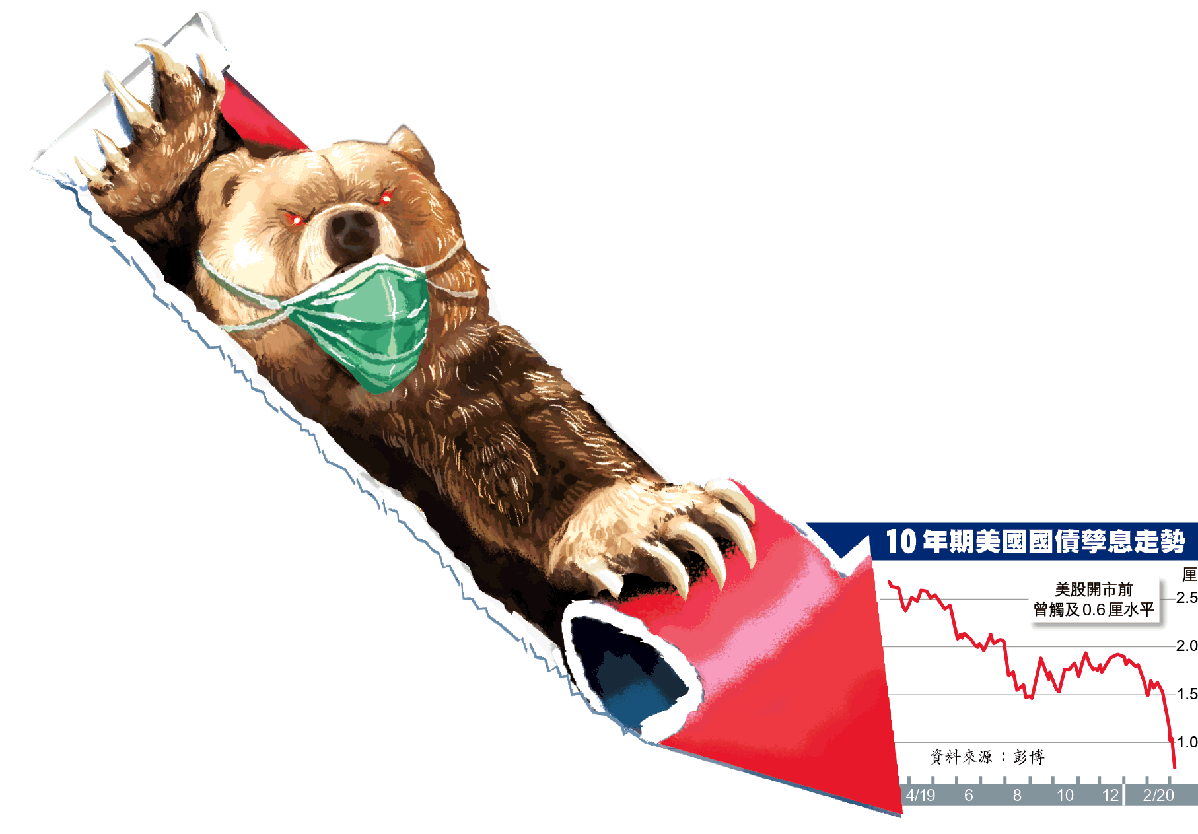 歐洲方面,重災區意大利的確診感染人數逼近四千宗,死亡個案約150宗,周邊的英國和德國疫情也日益嚴重。歐股向下,其中英、法、德股跌幅為3.8%至4.2%。全球大跌市下,資金避險至上。10年美國國債孳息續創新低,昨曾觸及0.6932厘,跟短期利率較敏感的兩年期美國國債孳息報0.46厘,逾四年低位。30年期美國國債孳息率由紀錄低回升,報1.29厘水平。