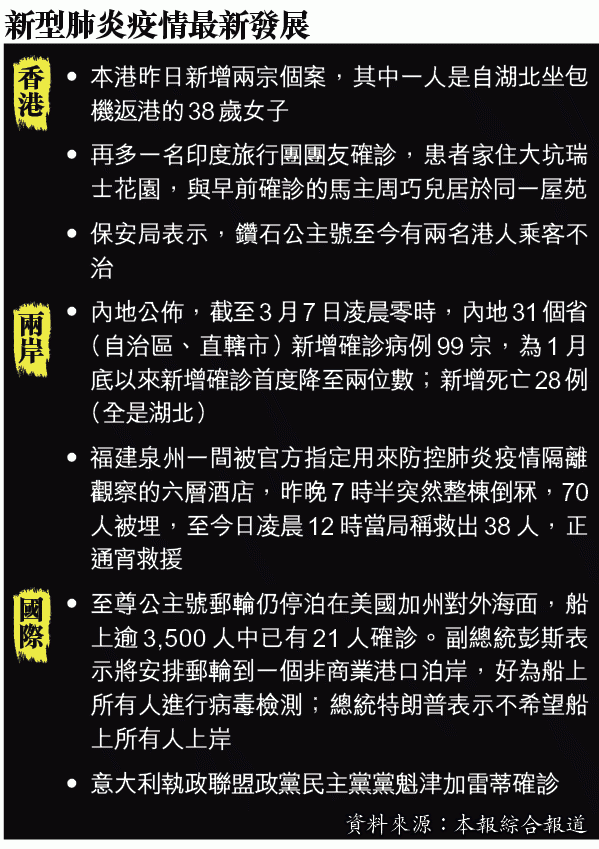 早前停泊於日本橫濱檢疫近一個月的鑽石公主號郵輪有兩名香港人確診武漢肺炎死亡,其中一名男子前日逝世,令船上總死亡人數增至七人;厚生勞動省因未得死者家屬同意,未有公開其身份和資料。而香港保安局就證實,早前另一名不幸離世的確診患者是持英國護照的香港居民,按其家人意願由英國政府提供協助。